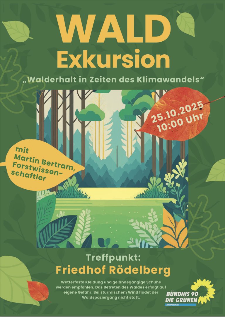 Auf Einladung des Ortsvereins von Bündnis 90/Die Grünen Langenselbold fand am Samstag den 25.10. am Rödelberg eine Informationsveranstaltung unter Führung des Forstwissenschaftlers Martin Bertram statt. Dieser stellte die Waldsituation, die Klimaschäden und das neue, naturnahe Management des Stadtwaldes vor.